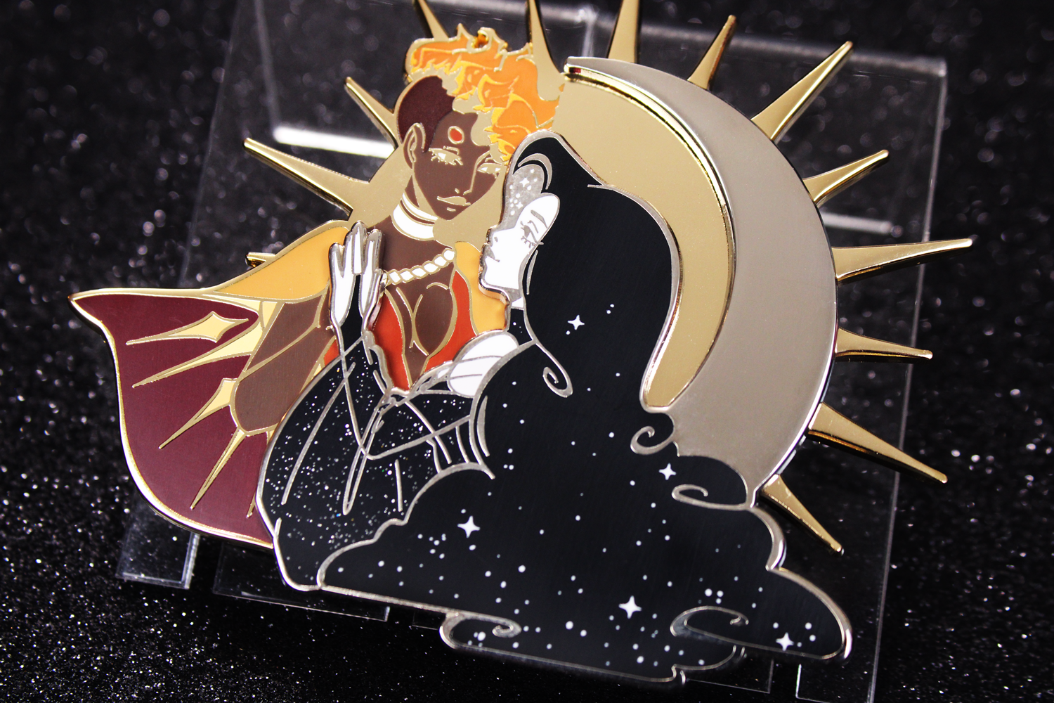 Eclipse is a huge 4 inch layered pin great as a centerpiece for an ita board or bag !